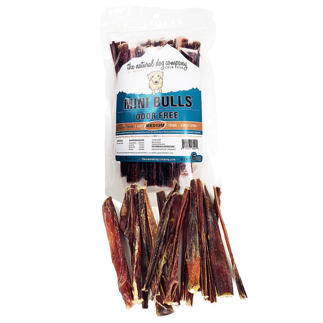 Description: These odor free Mini Bulls are made from the very tips of beef pizzle, so it’s a thinner and lighter chew compared to bully sticks made from the thick base of the pizzle. Each piece is about 6" long, and there is some variation in thickness.